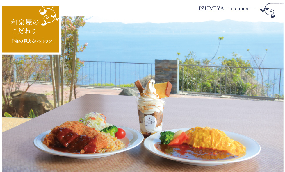 カステラ作り体験や工場見学が楽しめる長崎カステラランド。お越しの際にお立ち寄りいただきたいのが「海の見えるレストラン」です。眺望の美しさだけでなく、「こだわり」や「特別感」でもお客さまにお喜びいただけるよう、趣向を凝らしたメニューをご提供しております。例えば、一番人気の「カステラたまごのオムライス」。一般に市販されている卵よりもコクのある、和泉屋のカステラ専用卵を贅沢に使ったひと品です。目の覚めるような鮮やかなレモン色も食欲をそそります。
